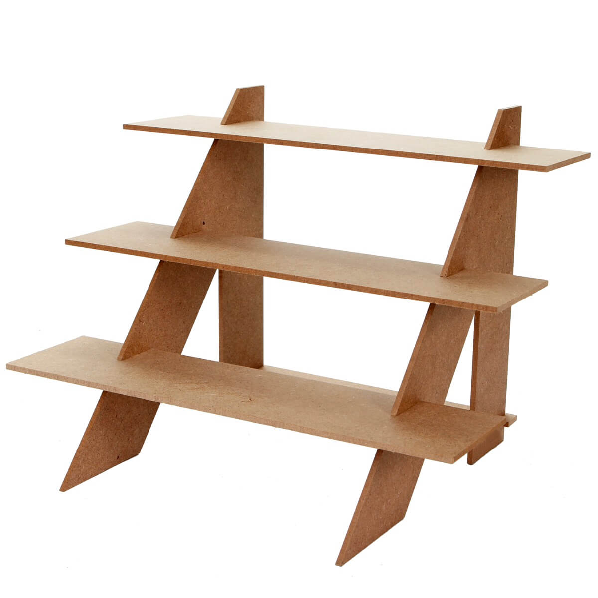 Adorno modelo escalera con tres peldaños que sobre salen de la estructura Es ideal para complementar barras y mesas de dulces, coloca en ellas pastelillos, saquitos de dulces cajitas con botanas