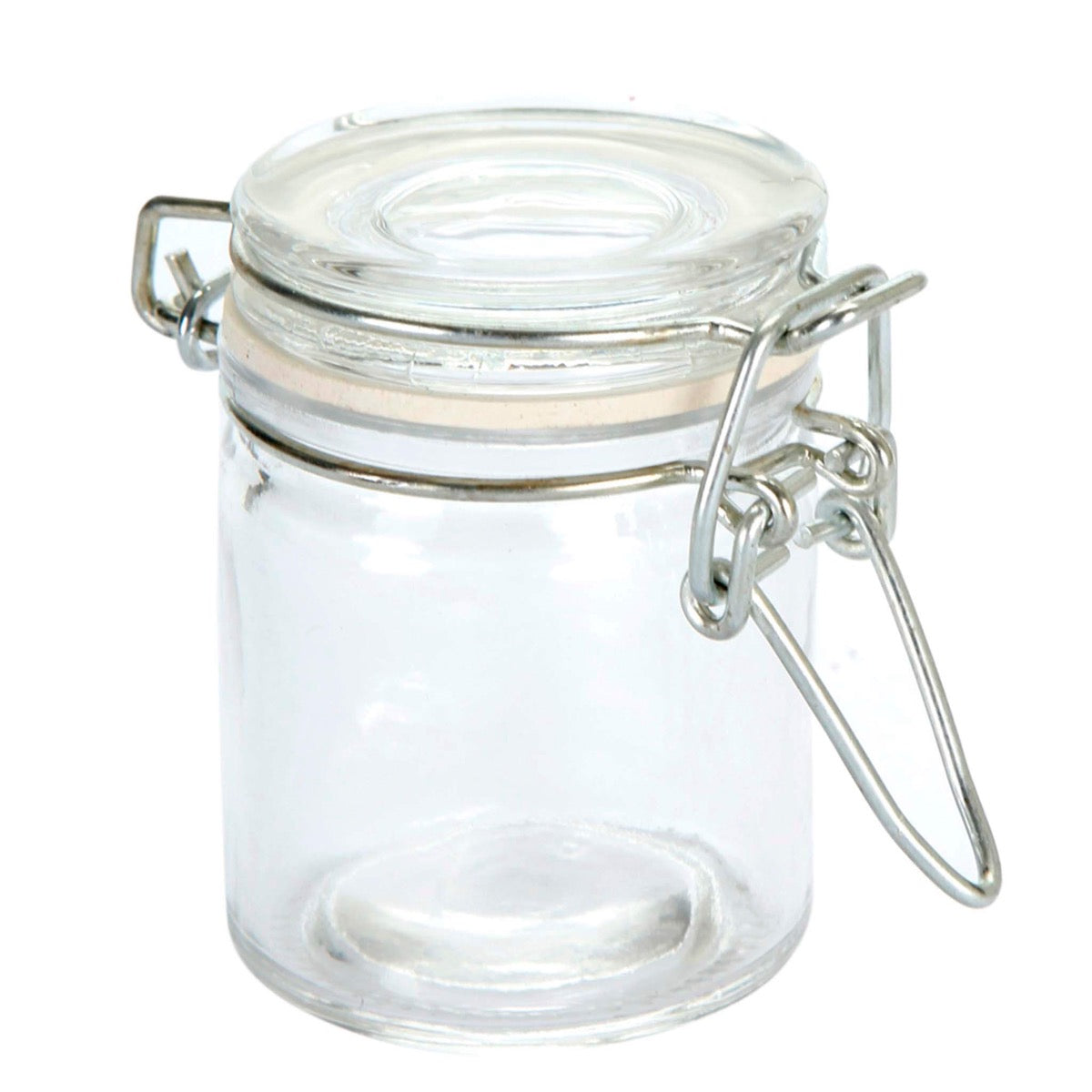 Frasco de cristal recto con empaque en boquilla, cuenta con un clip de seguridad evita derrames. Uso ideal en el hogar para conservas, complemento en tus ceremonias especiales.