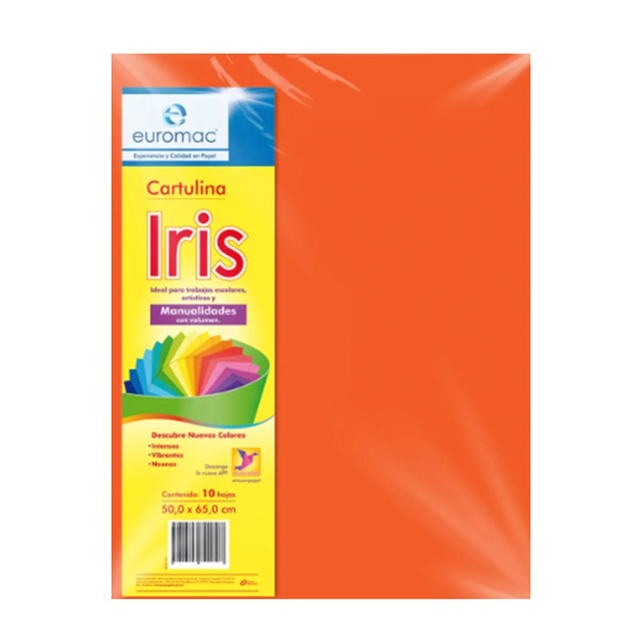 Cartulina Iris Naranja C/10: paquete con 10 hojas de cartulina color naranja, superficie lisa y resistente. Ideal para manualidades, presentaciones, tarjetas y proyectos escolares.