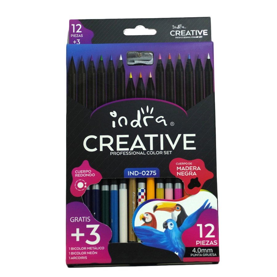 El set de Lápices de Colores Profesionales Indra Creative, modelo IND-0275, incluye 12 lápices de colores de alta calidad más 3 adicionales, sumando un total de 15 piezas. Cada lápiz cuenta con una mina gruesa de 4.0 mm y un cuerpo redondo de madera negra, proporcionando una cobertura óptima y trazos suaves.