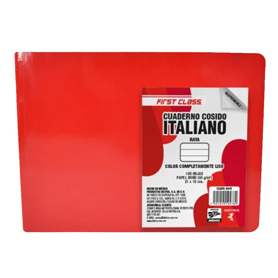 El Cuaderno Italiano Cosido First Class Dietrix 9478 Raya es un cuaderno profesional de formato italiano con encuadernación cosida resistente. Cuenta con 100 hojas de papel bond rayadas, ideal para uso escolar o de oficina. Su portada es lisa y está disponible en varios colores.