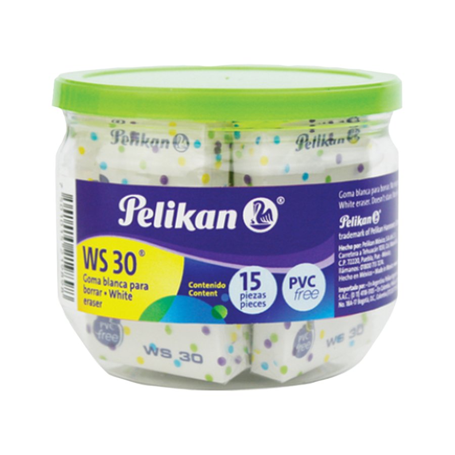 La Goma Pelikan WS 30 en presentación de bote con 15 piezas es una goma plástica blanca, libre de PVC y no tóxica, diseñada para borrar lápiz de grafito y de color de manera limpia y precisa sin dañar el papel. Su forma rectangular y textura suave permiten corregir errores incluso en espacios pequeños,++