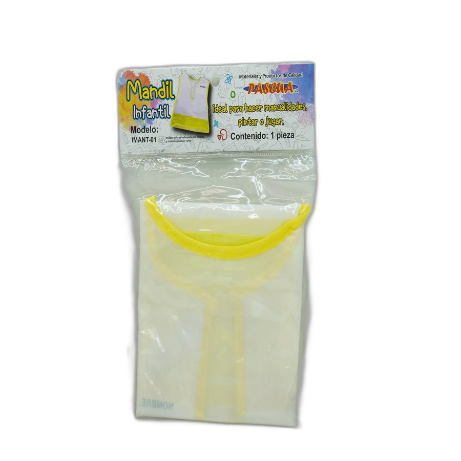 Mandil infantil marca Pascua modelo IMANT‑01 (Pascua), talla infantil. Está fabricado en vinil plástico resistente, fácil de limpiar y de secado rápido. Disponible en colores brillantes: amarillo, azul, rojo y verde.