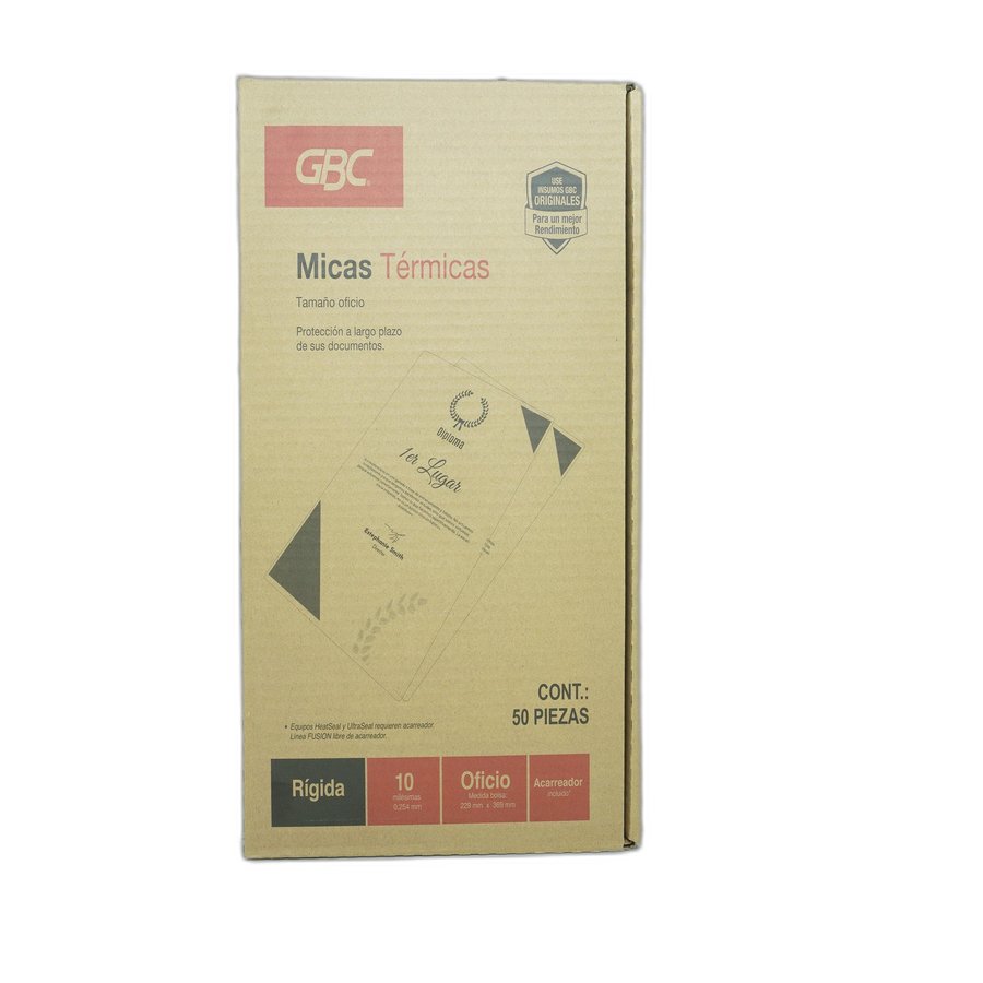 Mica térmica T/O 10 mil GBC c/50: paquete con 50 fundas tamaño carta (22.9 × 29.2 cm), grosor de 10 milésimas de pulgada; material rígido y transparente con acabado brillante, incluye acarreador para enmicado durable y presentación profesional.