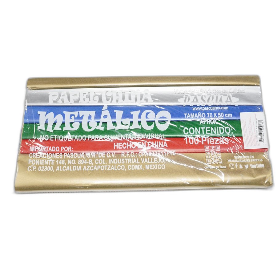 Papel china c/100 surtidos metálico Pascua: paquete con 100 hojas de papel seda con acabado metálico en colores variados, delgado y flexible, ideal para manualidades y decoraciones brillantes.