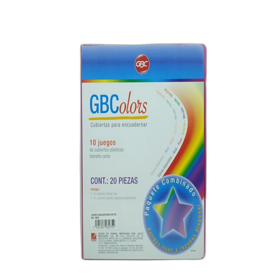 La Pasta GBCOLORS T/C Rosa Combinado 10 juegos: paquete de 20 cubiertas tamaño carta (10 lisas + 10 rayadas translúcidas) color rosa, grosor aproximado de 14 puntos (~0.35 mm), textura mixta para presentación estética y rigidez adecuada; ideal para encuadernados escolares u oficina en pequeña escala.