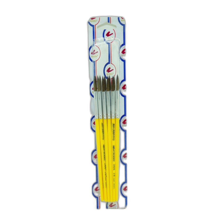 Pincel Redondo Rodin Serie 266 No. 16 – caja con 12 piezas: pincel de pelo natural de pony, mango corto lacado amarillo y virola de aluminio; formato redondo ideal para técnicas de acuarela, pintura escolar o manualidades.