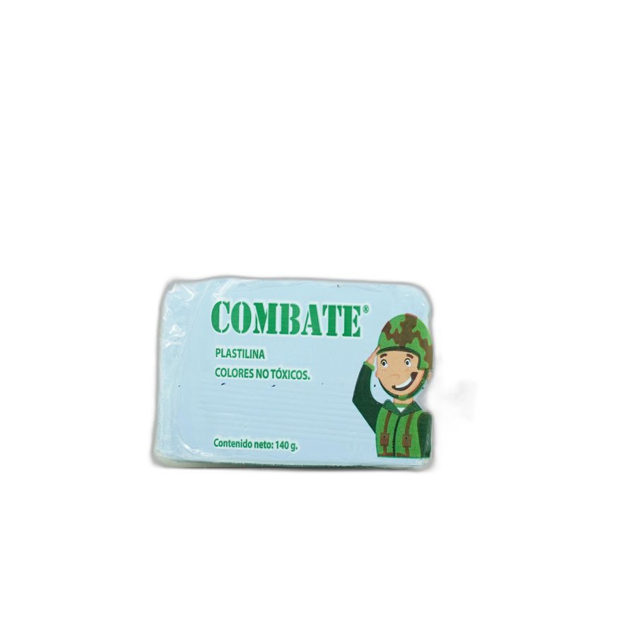 La plastilina Combate en barra de color azul claro es una masa moldeable de 140 gramos, ideal para actividades creativas y educativas. Su textura suave facilita el modelado y es apta para niños.