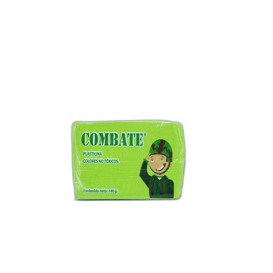 La plastilina Combate en barra de color verde claro es una masa moldeable de 140 gramos, ideal para actividades creativas y educativas. Su textura suave facilita el modelado, y es apta para niños.