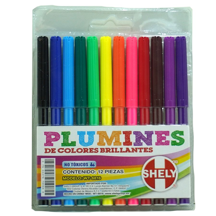 Los Plumones Shely modelo WT-6816, presentados en un estuche de 12 piezas, son marcadores de colores brillantes diseñados para actividades artísticas y escolares. Cada plumón cuenta con una punta fina que permite trazos precisos, adaptándose a diversas necesidades de dibujo y escritura.