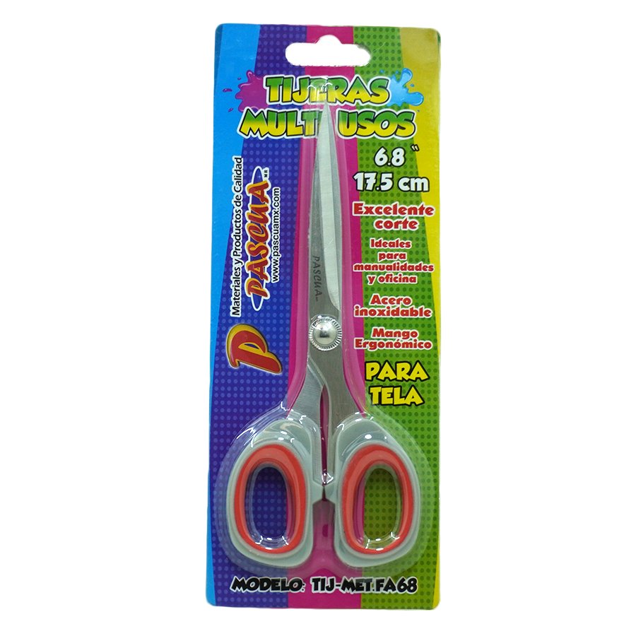 La Tijera Multiusos 6.8″ (17.5 cm) TIJ-MET.FA68 de Pascua es una herramienta versátil, fabricada en acero inoxidable con mango gris ergonómico, ideal para cortar papel, cartón, tela y más.